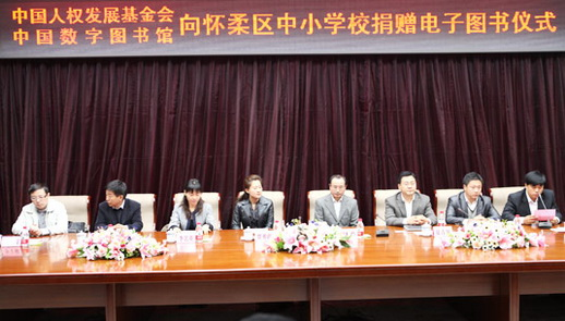 2011年11月4日怀柔区“书香校园”数字图书馆捐赠签约仪式在怀柔区教委举行?;橙崆坦の笔榧抢盍沃鞒只嵋?,怀柔区教委主任夏占利,中国人权发展基金会基金项目部主任贾会霞,中国数字图书馆副总裁张松林、数字图书馆事业部总监王磊、中数互联总经理李文毅,现代教育报副社长、副总编李艺英,怀柔区教工委书记刘生勃等领导及接受“书香校园”数字图书馆捐赠的怀柔区50所中小学校长出席活动。