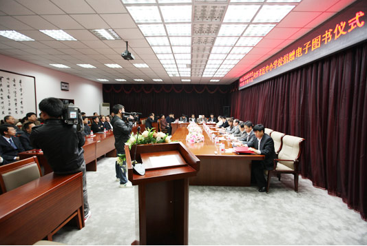 中国人权基金会基金项目部主任贾会霞、中国数字图书馆副总裁 张松林宣布捐赠决定,首次向怀柔区50所中小学捐赠总计价值三百余万元数字图书馆50套。每馆包含5000册图书,6000分钟音、视频,200部期刊等数字资源。数字图书馆事业部总监王磊与参会校长代表红螺寺中学校长于荣学签署“书香校园”数字图书馆技术服务协议。