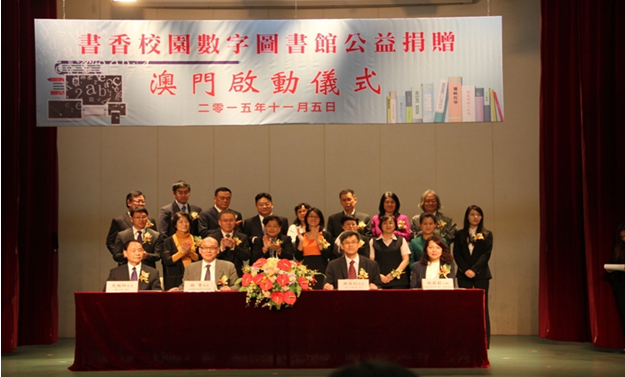 本网讯 为促进内地与澳门特区文化及教育交流,弘扬中华民族优秀传统文化,提高全民素质,提升国家文化软实力。中国国家图书馆、中国数字图书馆与澳门基金会达成共识,在澳门特别行政区全面展开公共文化服务。为此,中国人权发展基金会与主要捐赠方中国数字图书馆,于2015年11月5日下午在澳门濠江中学,启动了澳门特区“书香校园数字图书馆”大型公益捐赠活动。