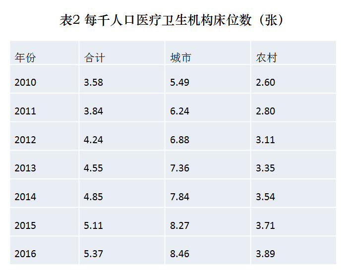 医疗卫生服务体系资源要素持续增加。2011年至2015年,国家投入420亿元,重点支持建设1500多个县级医院、1.8万个乡镇卫生院、10余万个村卫生室和社区卫生服务中心。截至2016年底,全国医疗卫生机构达983394个,其中医院29140个(公立医院12708个,民营医院16432个),乡镇卫生院36795个,社区卫生服务中心(站)34327个,疾病预防控制中心3481个,卫生监督所(中心)2986个,村卫生室638763个;全国统计的万元以上医疗设备共529.1万台,其中100万元以上的设备12.5万台。2016年,医疗机构床位数比2015年增加39.5万张,每千人口拥有床位数达到5.37张,医院床位数增加35.8万张;全国少数民族医医院有266所,床位数达26484张,年总诊疗968.7万人次,出院58.8万人次。