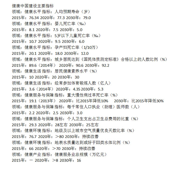 2012年以来,中国不断加大医药卫生体制改革力度,加快推进公立医院综合改革,推进药品和医疗服务价格改革,全面实施城乡居民大病保险,积极建设分级诊疗制度,优化完善药品生产流通使用政策。2015年10月29日,健康中国建设正式写入党的十八届五中全会公报。2016年8月,全国卫生与健康大会提出:“要坚持正确的卫生与健康工作方针,以基层为重点,以改革创新为动力,预防为主,中西医并重,将健康融入所有政策,人民共建共享。”2016年10月,国家颁布《“健康中国2030”规划纲要》,为推进健康中国建设,提高人民健康水平做出了战略部署。