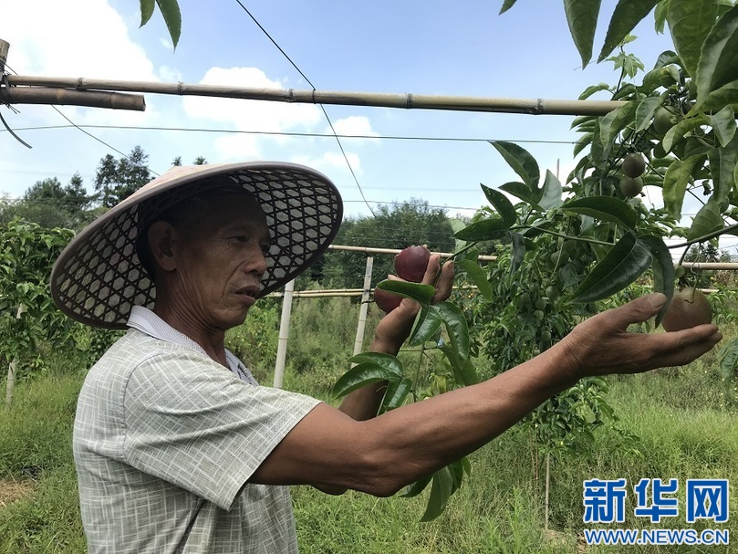7月31日,在江西省寻乌县南桥镇南龙村百香果种植基地,村民温俊浩正在采摘成熟的百香果,一个个百香果挂满枝头,呈现一派硕果累累的景象。近年来,江西省寻乌县在推进产业扶贫过程中,积极引导农民调整农业产业结构,做强绿色农业优势特色产业集群,确保全县脱贫攻坚主导产业发展实现全覆盖,切实让群众增收致富。新华网 杨益民 摄