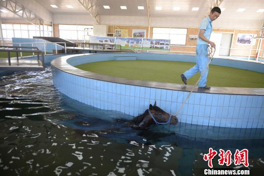 莱德马业练马师牵马在水池中游泳增加马匹肺活量 刘文华 摄