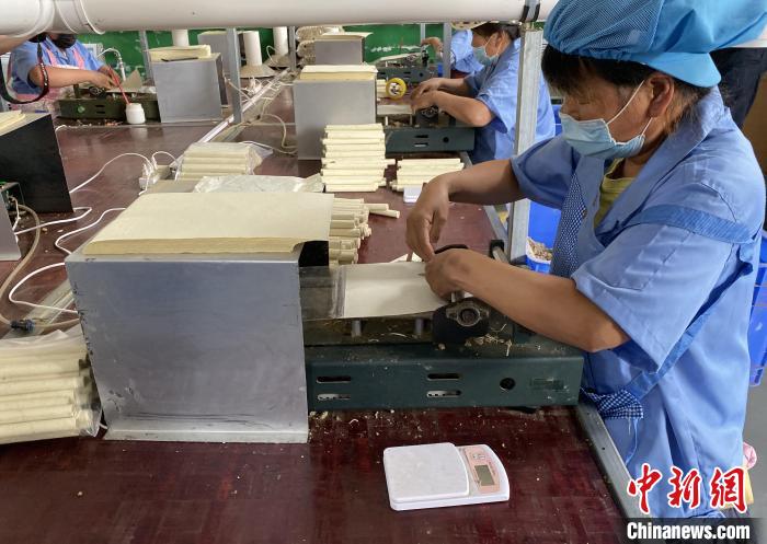 照金镇高尔塬村艾草加工厂里的员工正在卷艾条?!≌乓怀健∩?/span>