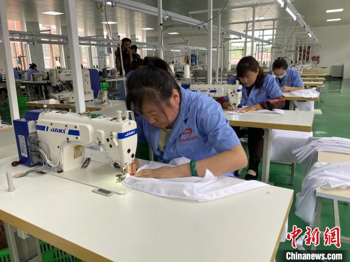 照金镇圣源小区社区工厂里的员工正在进行服装加工?!≌乓怀?摄