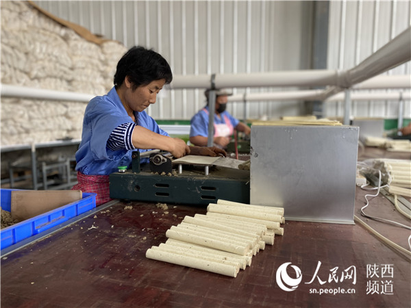 在位于耀州区照金镇高尔塬村的艾草加工厂,弥漫着艾草香味的工厂制作间里是一片忙碌的景象。高尔塬村村民张彩存坐在工作台前,熟练的将艾绒填进棉纸,再操作仪器卷制成棒,一个个艾棒在她手里被迅速地制作完成。