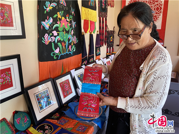 正月向记者展示自己16岁时绣的钱包。中国网记者 林伊人 摄