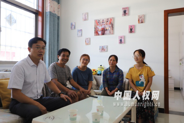 驻村扶贫干部李冰与秦发义一家在新房里交流。