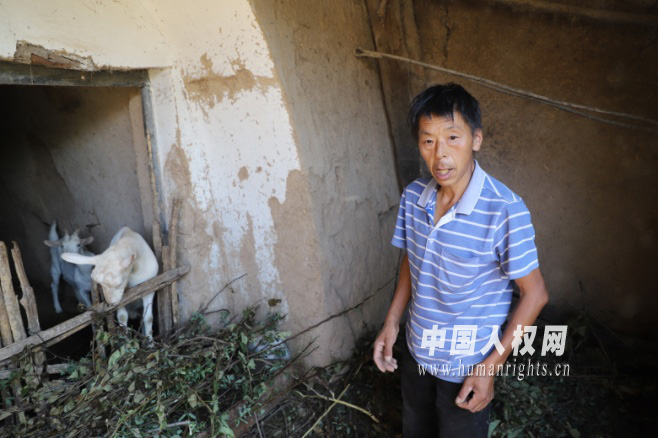 柴争宏正在给饲养的奶山羊喂食草料,原来的窑洞现在变成了羊圈。