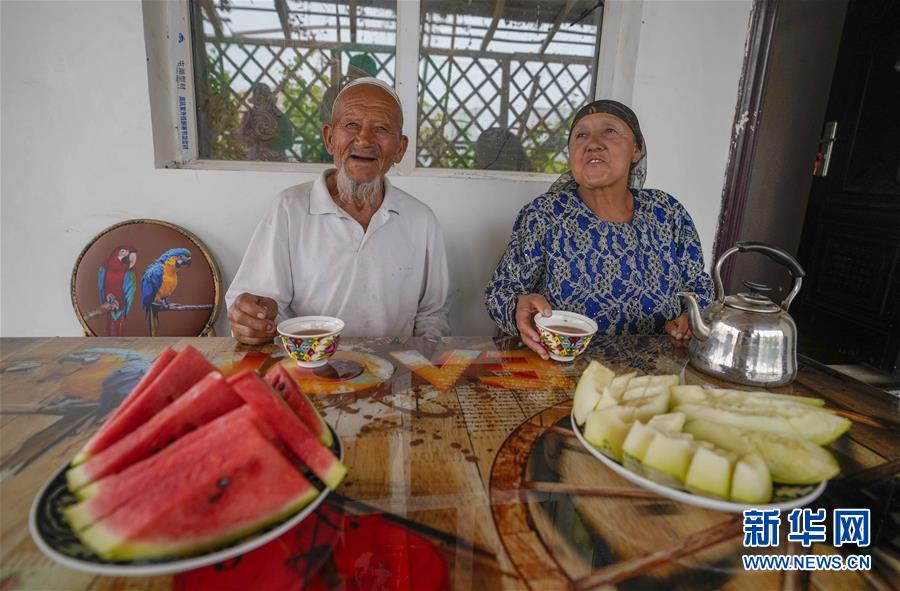 在新疆喀什地区伽师县江巴孜乡依帕克其村57号,80岁的维吾尔族老人伊米提·艾山(左)在自家庭院中(2020年6月8日摄)。新华社记者 赵戈 摄