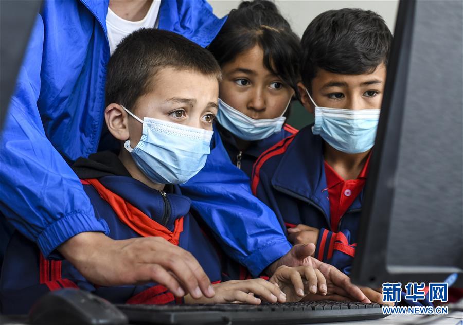 在新疆和田地区和田县塔瓦库勒乡巴克墩小学,三年级学生在支教老师明子栋的指导下学习使用电脑(2020年5月16日摄)。新华社记者 王菲 摄