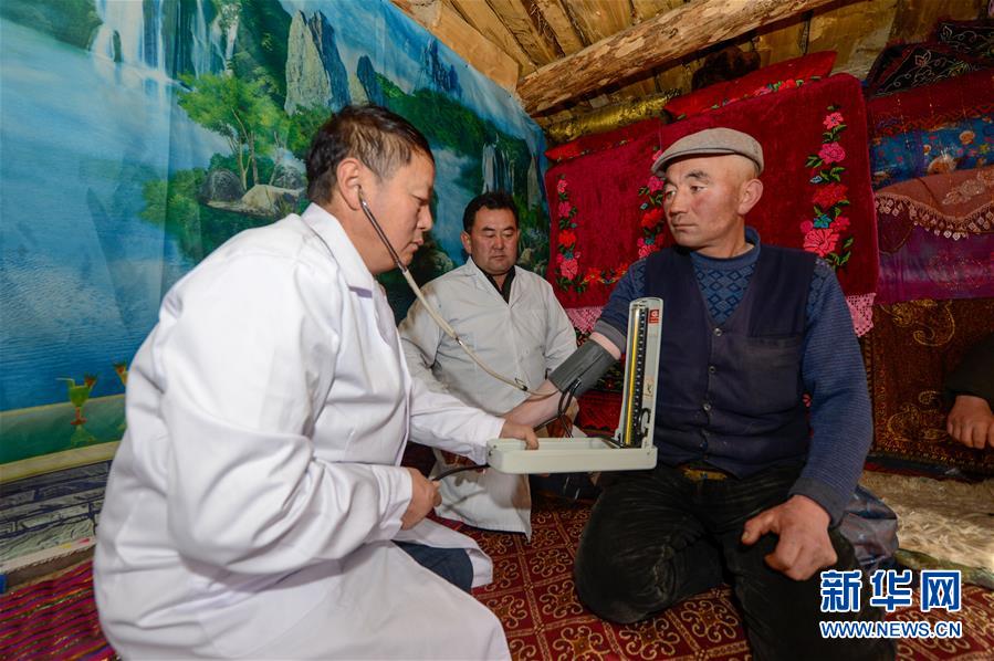在新疆昭苏县阿合牙孜冬季牧场,牧业医院的医生为牧民测量血压(2019年1月31日摄)。牧业医院的医生常年开展巡诊活动,守护牧民健康。新华社记者 丁磊 摄