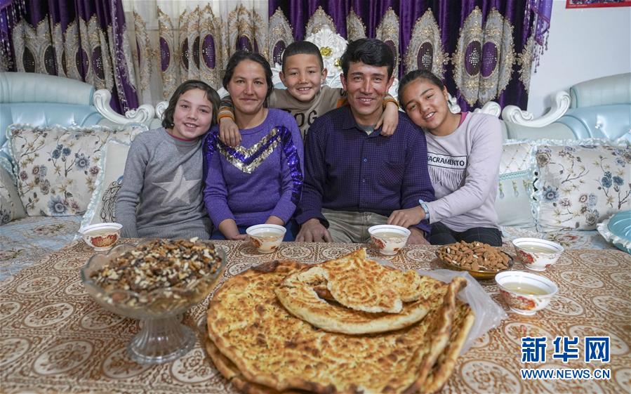 在位于新疆喀什地区泽普县桐安乡移民新村的新家中,热娜古丽·喀尔曼(左二)与家人一起准备吃早饭(2019年2月17日摄)。新华社记者 赵戈 摄