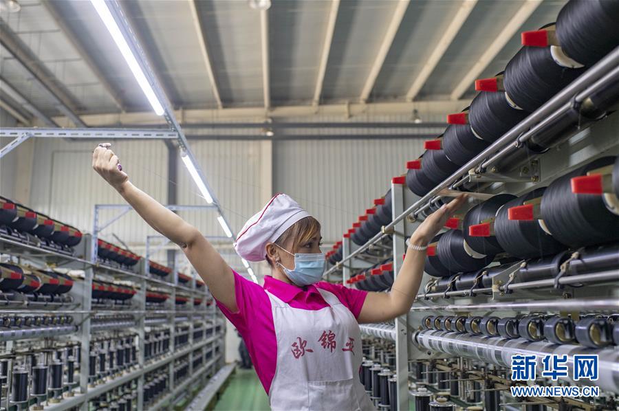在位于新疆和田地区策勒县天津工业园区内一家纺织企业的车间,33岁的阿丽屯古丽·图尔荪在生产线上忙碌(2020年9月20日摄)。新华社记者 胡虎虎 摄