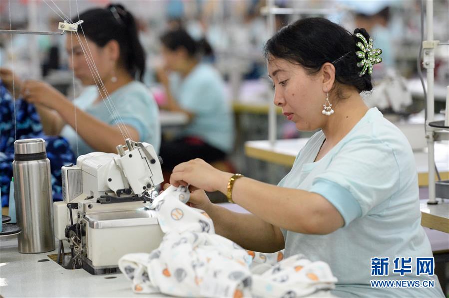 在新疆和田地区和田县布扎克乡思源扶贫产业园,工人在制作服装(2019年8月31日摄)。新华社记者 丁磊 摄