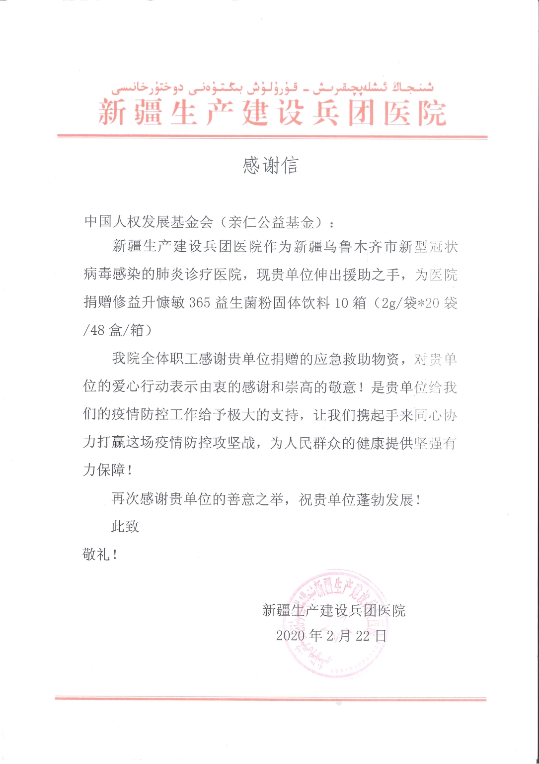 亲仁公益基金收到新疆生产建设兵团医院的感谢信。