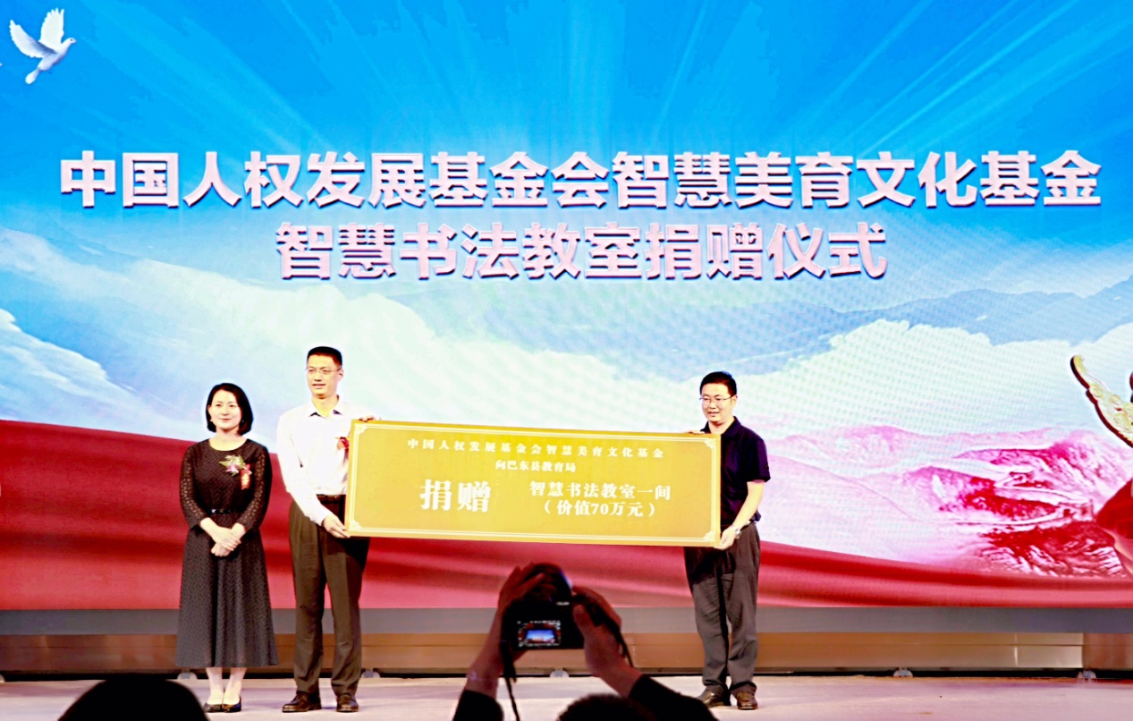 6月26日,中国人权发展基金会智慧美育文化基金向湖北省巴东县教育局捐赠“智慧书法教室”仪式在武汉举行。中国人权发展基金会基金项目部主任贾会霞、项目主管陈永,湖北省巴东县教育局副局长龚年成,中国教育装备行业协会未来教育装备分会副理事长、北京华文众合科技有限公司董事长向大凤等参加捐赠仪式。