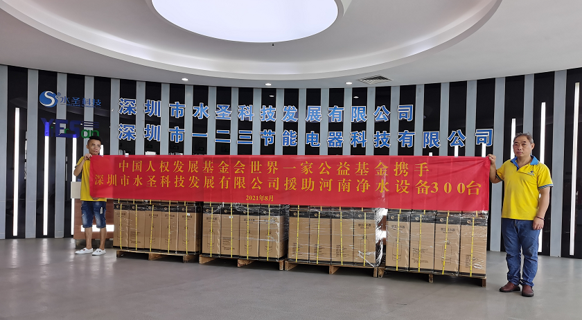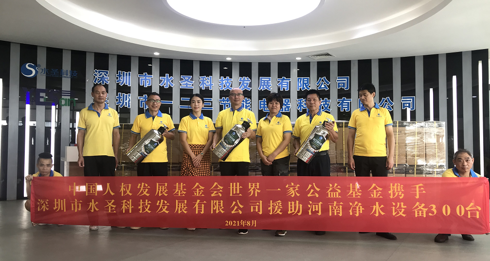 2021年7月20日,河南多地遭受极端强降雨袭击后,中国人权发展基金会世界一家公益基金第一时间携手深圳市水圣科技发展有限公司,向河南省新密市防汛指挥部(穗华心教育营地/新密市开阳路北段)、驻马店市上蔡县邵店镇高李村、河南省周口市西华县艾岗乡半截楼村,捐赠300台净水设备物资提供支持。