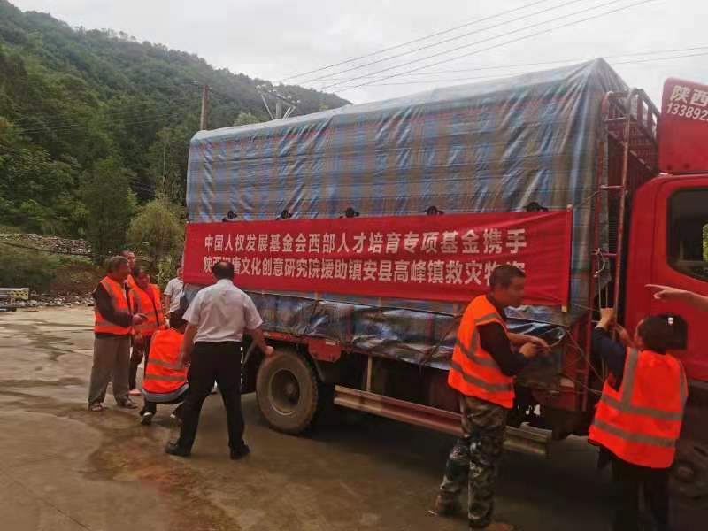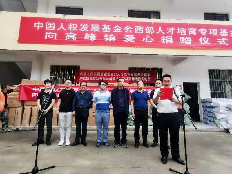 9月2日,中国人权发展基金会西部人才培育专项基金负责同志和陕西颐昌实业有限公司、西安森木星河商贸有限公司、西安雷士照明工程有限公司相关人员向陕西省镇安县高峰镇捐赠现金10万元和棉被、救灾帐篷、行军床、矿泉水、方便面、照明灯具等救灾生活物资,用于镇安县高峰镇救灾工作。