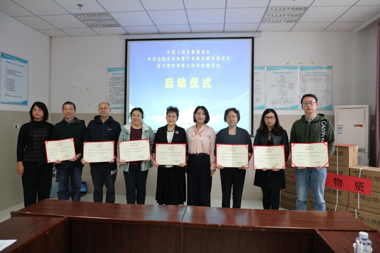 活动中,我会为中华志愿者协会医疗专家志愿者委员会专家颁发荣誉证书,向科右中旗捐赠价值330万元医疗物资。