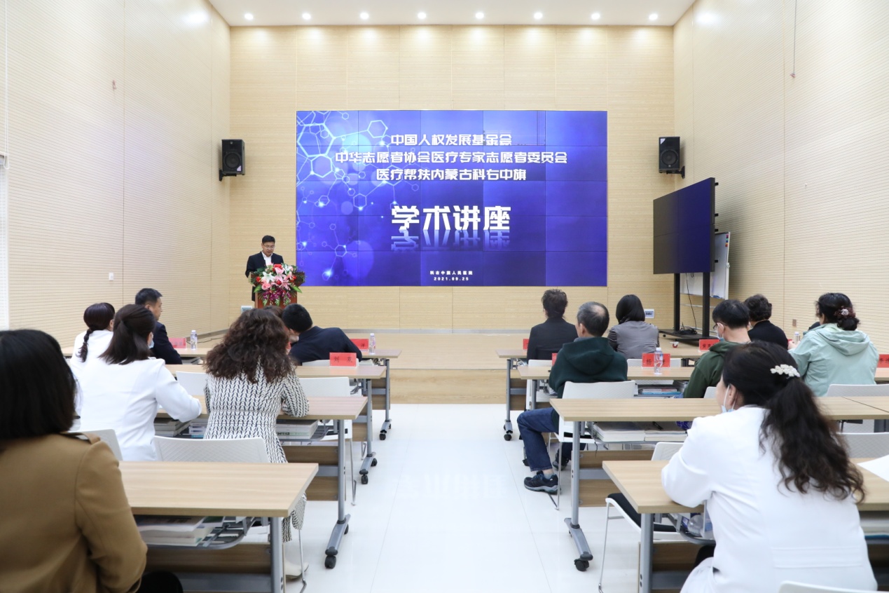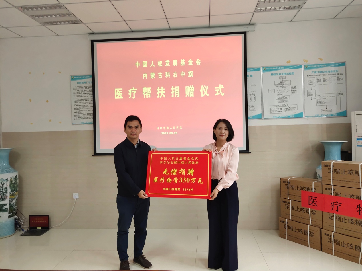 9月25日,中国人权发展基金会携手中华志愿者协会医疗专家志愿者委员会医疗帮扶科右中旗启动仪式和捐赠仪式在科右中旗人民医院举行。中国人权发展基金会基金项目部主任贾会霞、业务主管左暄,中华志愿者协会医疗专家志愿者委员会主任张晓艳及其团队专家,科右中旗副旗长王秀华、副旗长汪洋等出席活动。