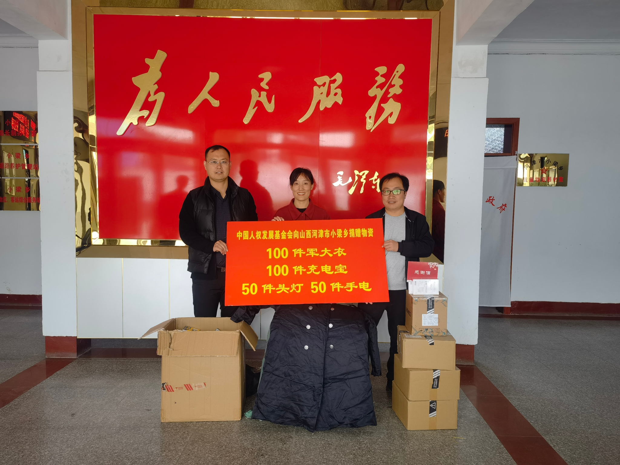 灾情发生后,河津市小梁乡的家园被洪水淹没,部分电力设施被毁导致照明困难,一些村民应急物资短缺,特别是随着天气转冷,灾区急需防寒保暖物资。中国人权发展基金会法律援助专项基金积极联系小梁乡政府,了解当地受灾和物资需求情况,紧急采购了100件军大衣、100件头灯、100件充电宝等救灾物资,迅速寄往灾区,帮助当地受灾群众渡过难关。