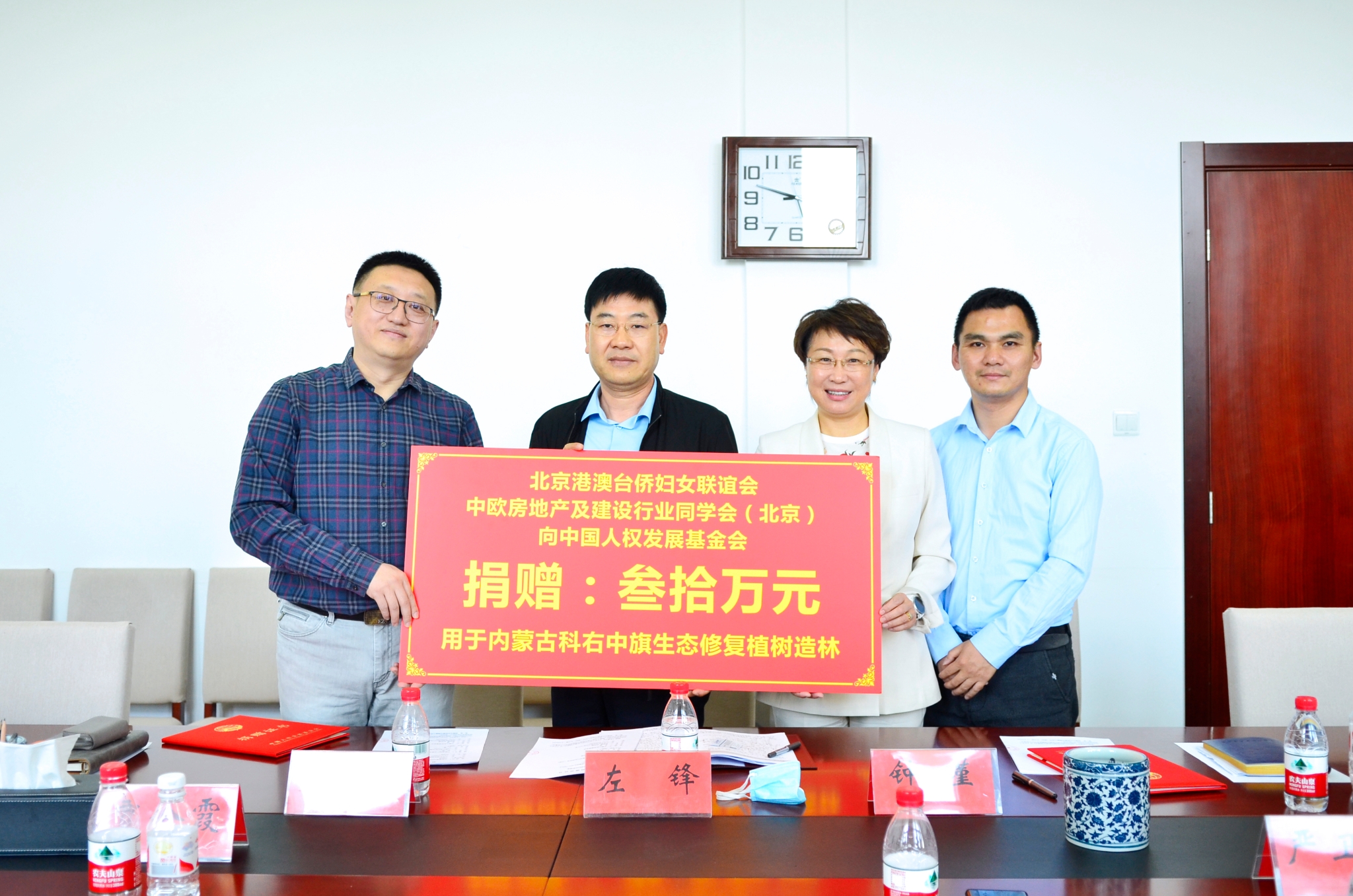 中央宣传部人权发展和交流中心主任左锋,中国人权发展基金会副秘书长秦亮、基金项目部主任贾会霞、生态修复公益基金副主任唐旭,北京港澳台侨妇女联谊会常务副会长钟瑾,中欧商学院房地产及建设行业同学会(北京)副会长成欣,科右中旗副旗长汪洋等出席捐赠仪式。