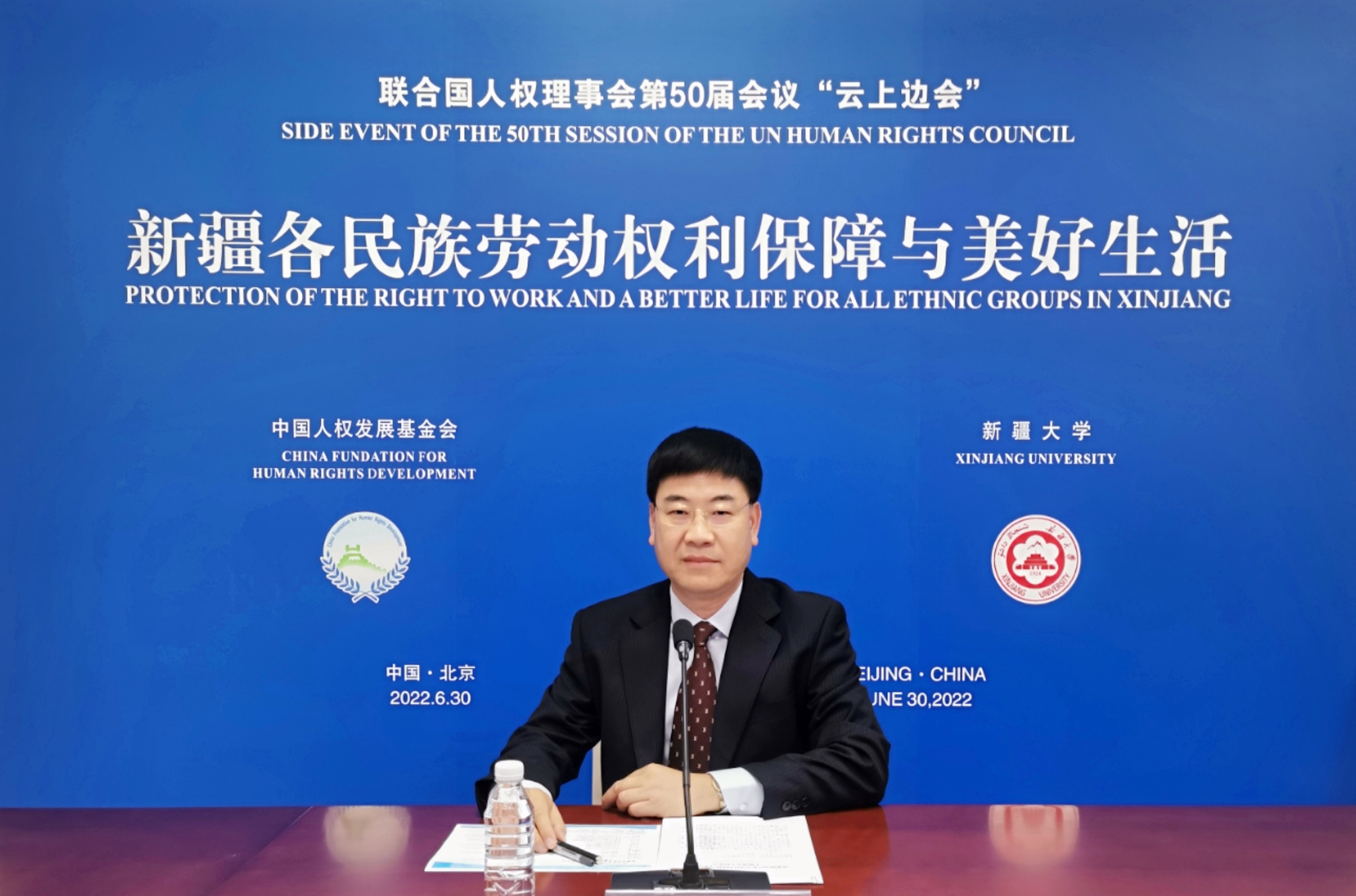 中国有句古话,“志合者,不以山海为远”。在联合国人权理事会第50届会议召开期间,我们相聚云端,参加由中国人权发展基金会主办、新疆大学承办的“新疆各民族劳动权利保障与美好生活”主题边会,共话人权议题,共促人权发展。在此,我代表中国人权发展基金会,对新疆大学筹办此次边会表示衷心感谢,对各位嘉宾参与边会表示热烈欢迎!
